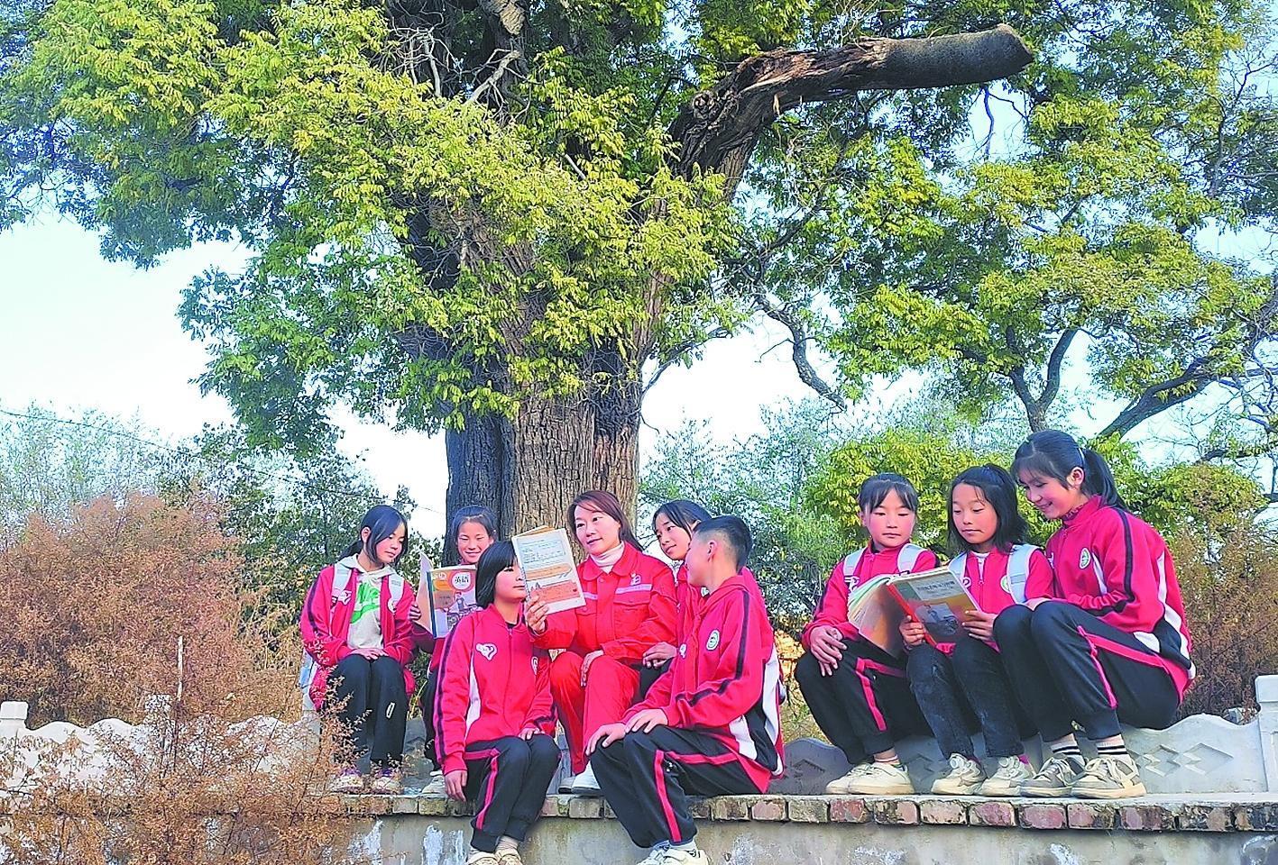 教育帮扶支教老师带领甘肃东乡那勒寺镇大树村石化小学学生阅读课文。董鑫摄